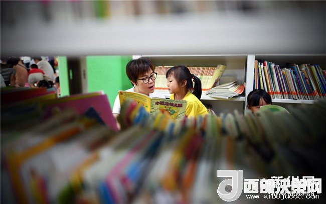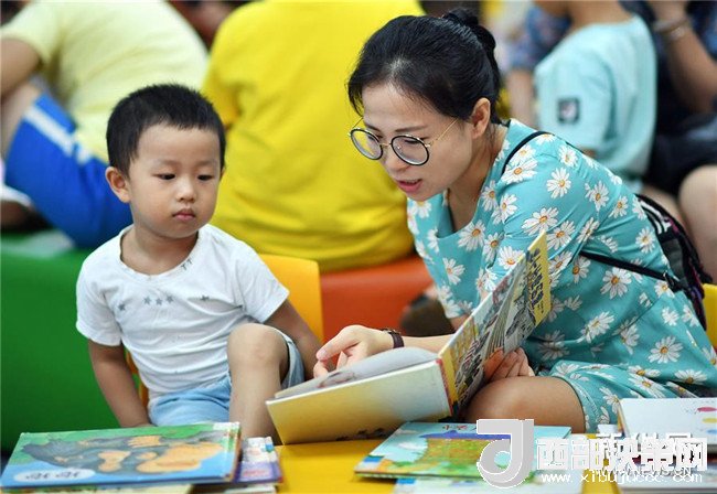 7月15日,家長(zhǎng)帶著孩子在海南省圖書館看書。
