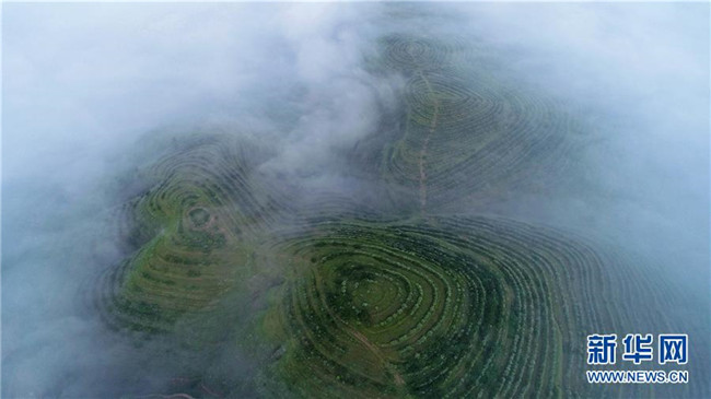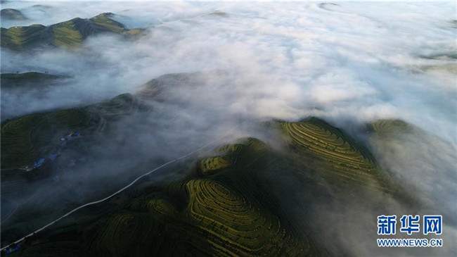 云霧繚繞的寧夏彭陽縣金雞坪梯田公園(7月17日攝)。新華社記者王鵬攝