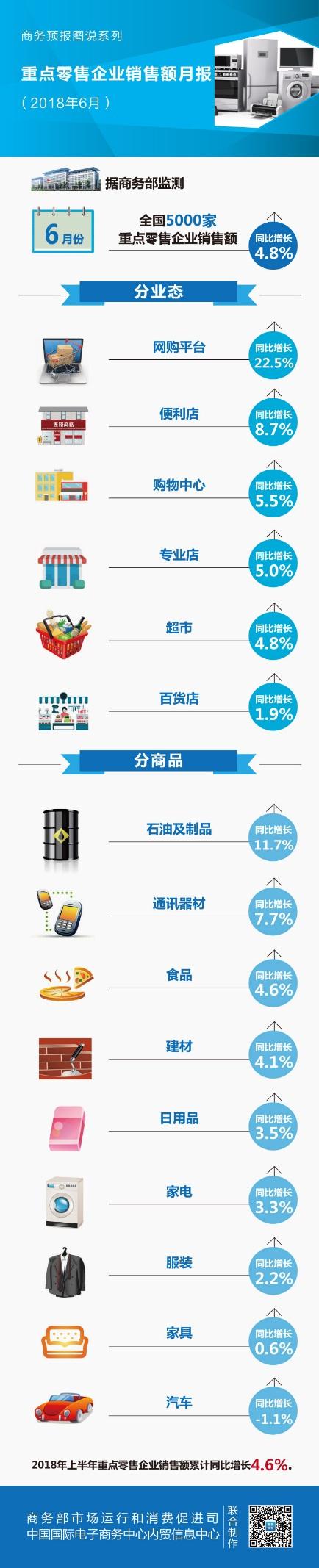 據(jù)商務(wù)部監(jiān)測,2018年6月,全國5000家重點(diǎn)零售企業(yè)銷售額同比增長4.8%。上半年重點(diǎn)零售企業(yè)銷售額累計(jì)同比增長4.6%。