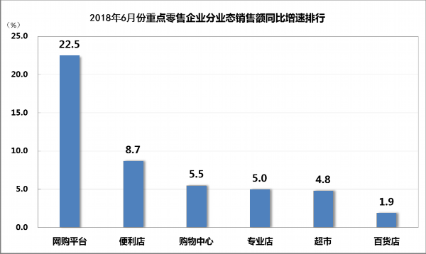 網(wǎng)購平臺銷售額同比增長22.5%,便利店、購物中心、專業(yè)店銷售額同比分別增長8.7%、5.5%、5.0%,超市、百貨店銷售額同比分別增長4.8%和1.9%。