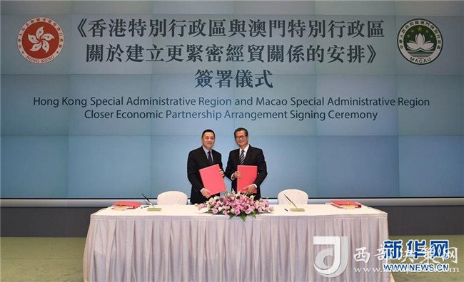 香港特區(qū)政府財(cái)政司司長(zhǎng)陳茂波(右)和澳門特區(qū)政府經(jīng)濟(jì)財(cái)政司司長(zhǎng)梁維特在香港簽署《香港特別行政區(qū)與澳門特別行政區(qū)關(guān)于建立更緊密經(jīng)貿(mào)關(guān)系的安排》(2017年10月27日攝)。新華社記者呂小煒攝