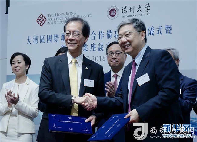 2018年7月18日,在香港理工大學(xué),香港理工大學(xué)校長(zhǎng)唐偉章和深圳大學(xué)校長(zhǎng)李清泉(前右)簽署“大灣區(qū)國(guó)際創(chuàng)新學(xué)院”合作備忘錄后握手。新華社發(fā)(王申攝)