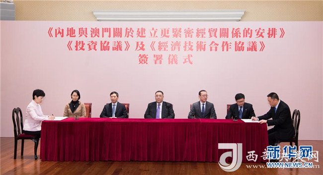 2017年12月18日拍攝的商務(wù)部與澳門特區(qū)政府《內(nèi)地與澳門關(guān)于建立更緊密經(jīng)貿(mào)關(guān)系的安排》(CEPA)下的《投資協(xié)議》和《經(jīng)濟(jì)技術(shù)合作協(xié)議》簽約儀式現(xiàn)場(chǎng)。新華社記者張金加攝