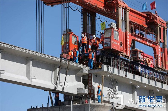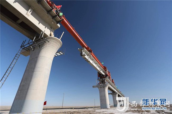 這是位于新疆若羌縣的臺特瑪湖特大橋施工現(xiàn)場(8月17日攝)。8月17日11時58分,在一組架橋機(jī)和運梁機(jī)的協(xié)調(diào)配合下,隨著最后一孔T型梁上的梁體精準(zhǔn)吊裝到位,全長24.558公里、歷時2年建設(shè)的格庫鐵路(青海格爾木——新疆庫爾勒)最長鐵路橋——新疆臺特瑪湖特大橋?qū)崿F(xiàn)合龍。新華社發(fā)