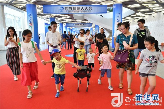 孩子們在2018世界機(jī)器人大會(huì)上跟隨一款四足機(jī)器人(8月15日攝)。 新華社記者 李鑫 攝