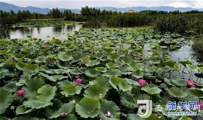 8月22日無人機(jī)拍攝的廣靈縣壺流河濕地盛開的荷花。新華社記者 陶明 攝
