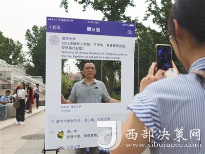 清華園內(nèi),隨處可見(jiàn)與錄取通知書(shū)合影留念的景象。今年的錄取通知書(shū)一亮相就成了“網(wǎng)紅”,通知書(shū)中夾帶了一張3D“二校門(mén)”,打開(kāi)通知書(shū)“二校門(mén)”就會(huì)“躍然紙上”,初來(lái)乍到自然少不了和“網(wǎng)紅”合影。