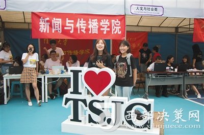 在綜合體育館門(mén)口,各院系報(bào)到區(qū)的學(xué)長(zhǎng)學(xué)姐們已早早準(zhǔn)備好,等待“八字班”新生的到來(lái)。迎新自然少不了“吉祥物”,有的學(xué)長(zhǎng)還穿起玩偶裝,時(shí)不時(shí)與新生互動(dòng)一番。