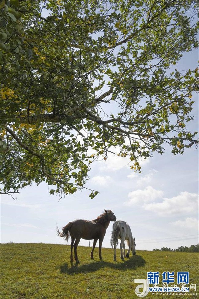 9月1日,兩匹馬在內(nèi)蒙古烏蘭布統(tǒng)草原的樺樹下吃草。
