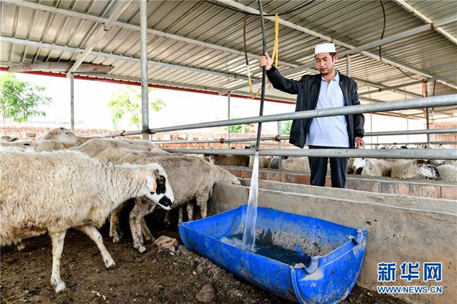 在中寧縣喊叫水鄉(xiāng)賀家口子村,養(yǎng)殖戶賀學銀在給羊喂水(9月6日攝)。新華社記者 郭緒雷 攝
