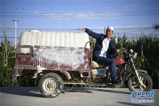 在中寧縣喊叫水鄉(xiāng)賀家口子村,村民賀金文在介紹他曾經(jīng)到外地拉水時用的水桶(9月6日攝)。新華社記者 王鵬 攝