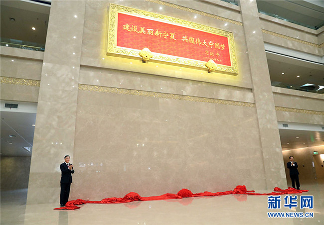在贈(zèng)送紀(jì)念品儀式上,汪洋和寧夏回族自治區(qū)黨委書記、人大常委會(huì)主任石泰峰,一同為習(xí)近平總書記題詞賀匾揭幕。