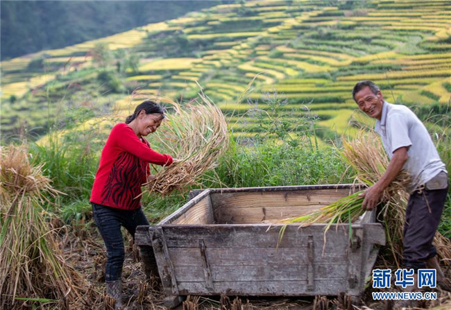 9月19日,花田鄉(xiāng)何家?guī)r村村民冉紅兵(右)齊書仙夫婦收獲稻米后回家。記者劉潺攝