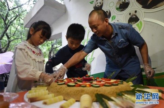 9月24日,在重慶動(dòng)物園,工作人員與小朋友為大熊貓“新星”手工特制“月餅”。 當(dāng)日是中秋節(jié),重慶動(dòng)物園工作人員邀請(qǐng)小朋友與36歲的大熊貓“新星”一同過(guò)中秋節(jié)。在工作人員的指導(dǎo)下,小朋友們用水果、蔬菜和麥粑特制一份月餅送給“新星”。 新華社記者唐奕攝