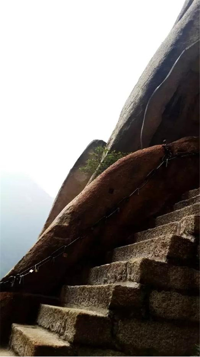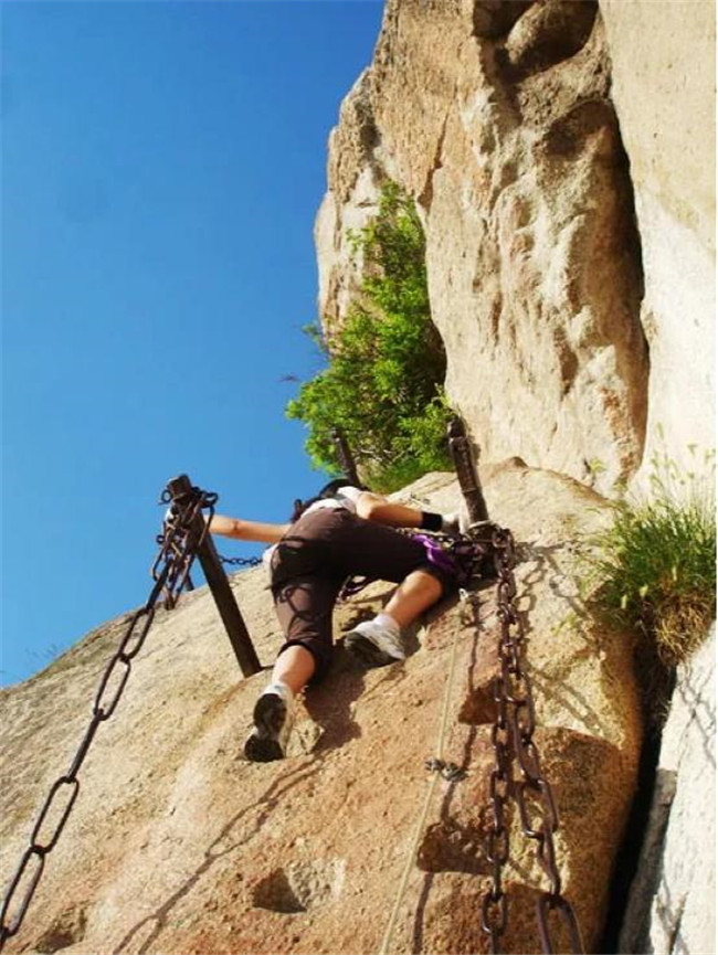 這是一條峭壁上的大裂縫,陷在兩旁的巨石之間,共370余級(jí)臺(tái)階坡度極陡,每級(jí)臺(tái)階的寬度不過三分之一的腳掌,幸好兩旁都有可助攀爬的鐵鏈。仰望天際,一線天開。俯視腳下,如臨深淵。石級(jí)頂端有如井口,倘若把“井口”用鐵蓋蓋住,通往華山的道路便被堵塞,所以稱之為“太華咽喉”。