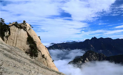 華山的云多變化。有時(shí),天空晴朗,山腰間浮著幾朵白云,像鳥(niǎo)兒在盤(pán)旋;有時(shí),一帶云霧纏繞在峰嶺間,絲絲縷縷,如纖纖玉女般纏綿而多情;有時(shí),山谷間被云霧填滿(mǎn),僅露出一個(gè)山尖兒置身其間宛若在仙宮別苑;有時(shí),云海茫茫,云波涌蕩,恍若隔世;有時(shí),云霧包裹了山巒,人就在云中,移步生煙、吐納含瑞被云霧挾裹著,忘記了塵器的凡俗,忘記了世事的究雜,身心全都融化在了這超然的情境當(dāng)中。