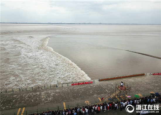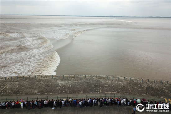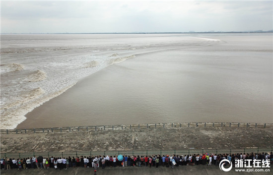 9月26日,農(nóng)歷八月十七,海寧大缺口觀(guān)潮點(diǎn),千名游客在江堤上安全觀(guān)潮。據(jù)海寧鹽官水文站預(yù)測(cè),從當(dāng)天開(kāi)始,錢(qián)塘江進(jìn)入最佳觀(guān)潮期,預(yù)計(jì)八月十八大潮日,潮高會(huì)在1.5米左右。(浙江在線(xiàn)記者 董旭明 攝)
