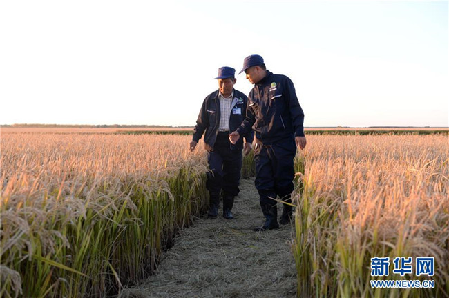 黑龍江建三江七星農(nóng)場(chǎng)職工秦泗利(左)和工友在查看今年水稻的長勢(shì)(9月26日攝)。 新華社記者王凱攝
