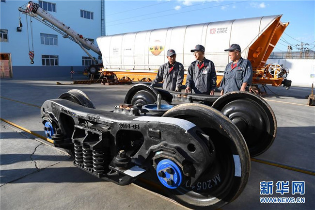 中車齊車集團(tuán)有限公司教授級(jí)高工李向偉(中)介紹企業(yè)生產(chǎn)的重載技術(shù)領(lǐng)先的中交叉轉(zhuǎn)向架(9月26日攝)。 新華社記者王建威攝