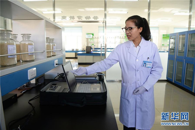 黑龍江北大荒建三江國家農(nóng)業(yè)科技園區(qū)工作人員裴鑫宇在做谷物品質(zhì)檢測(cè)(9月27日攝)。新華社記者王凱攝