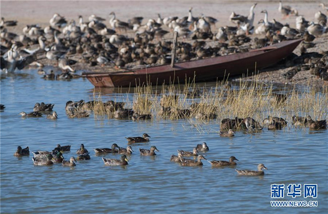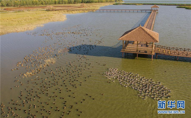 在吉林省松原市查干湖野鴨島,成群野生水禽在水中游弋(9月27日攝)。新華社記者許暢攝