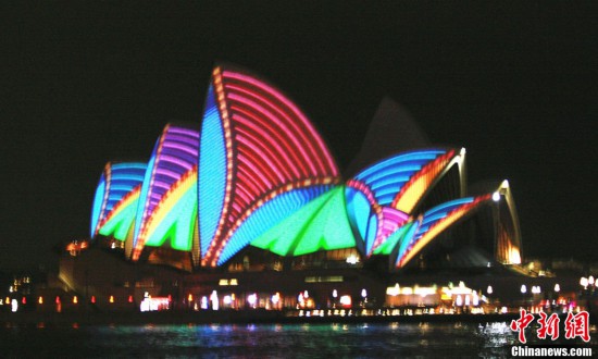 資料圖:澳大利亞的著名標(biāo)志性建筑悉尼歌劇院在燈光的裝飾下,夢幻迷人,五彩奪目。中新社發(fā) 沙長華 攝