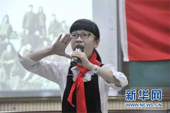 2016年5月31日晚,椒江區(qū)一名小學(xué)生在有關(guān)學(xué)習(xí)墾荒精神的主題班會上發(fā)言。新華社記者 王俊祿 攝