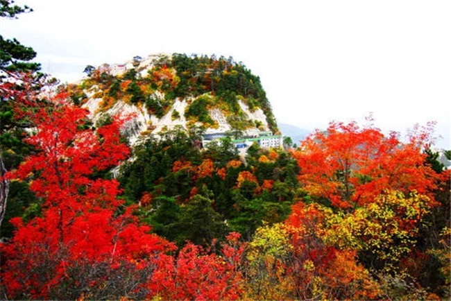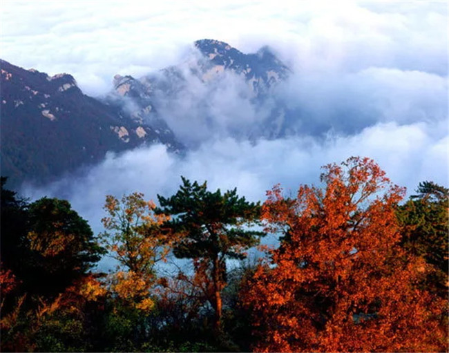 鷂子翻身、長空棧道、蒼龍嶺,更是險中紅葉別樣紅。西峰上茫茫云海,紅葉相伴,美輪美奐。