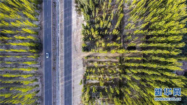 車輛行駛在新疆阿克蘇地區(qū)柯柯牙綠化工程核心區(qū)(9月20日無人機(jī)拍攝)。新華社記者 胡虎虎 攝