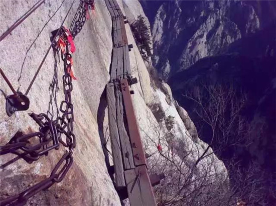 金鎖關(guān):到達金鎖關(guān)時,眼前大片大片的紅色,游人的視覺和心靈受到強烈的沖擊。這是沿路兩邊鐵鏈上綁滿的密密麻麻的紅色絲繩,不留一絲空隙,風(fēng)吹來,長長的紅色絲繩就輕盈的舞起來,如愛情牢固的臂膀,甜蜜的飛翔在華山之上。讓一把感情鎖和華山一同到地老天荒,成為一個“山無陵,天地絕,乃敢與君絕”的千古情愛神話。