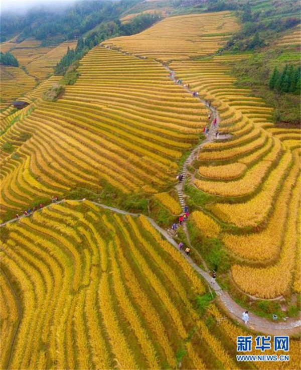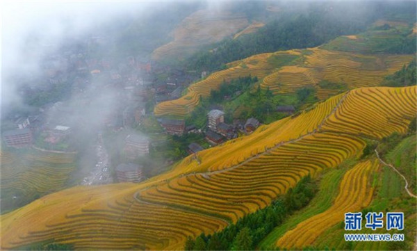 10月16日,游客在秋雨中欣賞龍脊梯田秋色(無人機(jī)拍攝)。金秋時(shí)節(jié),廣西龍勝各族自治縣龍脊梯田美如畫卷。 新華社記者 黃孝邦 攝