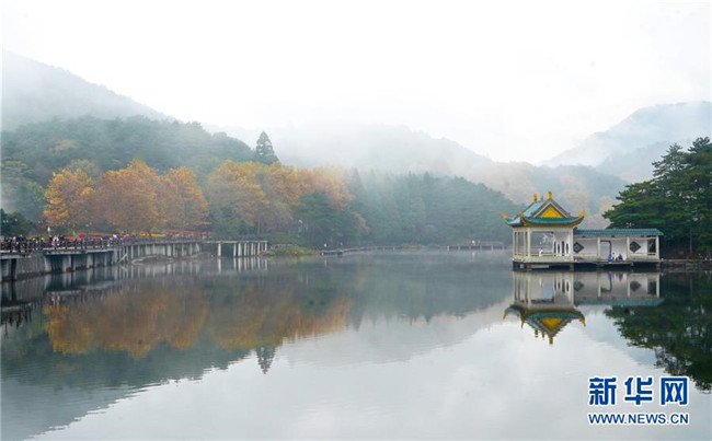 當日,位于江西省九江市廬山風(fēng)景區(qū)內(nèi)的如琴湖云霧繚繞,層林盡染,吸引眾多游客前來觀賞游玩。