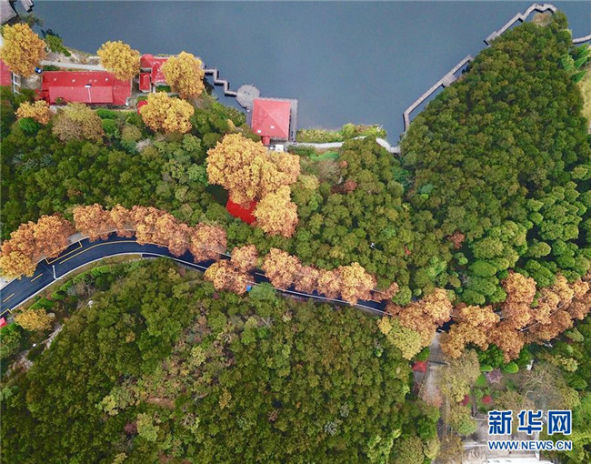 這是如琴湖旁公路的秋色風(fēng)光(10月20日無人機拍攝)。 新華社記者 胡晨歡 攝