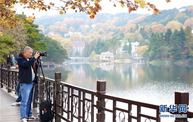 游客在九江市廬山風(fēng)景區(qū)內(nèi)的如琴湖旁攝影(10月20日攝)?!⌒氯A社記者 胡晨歡 攝