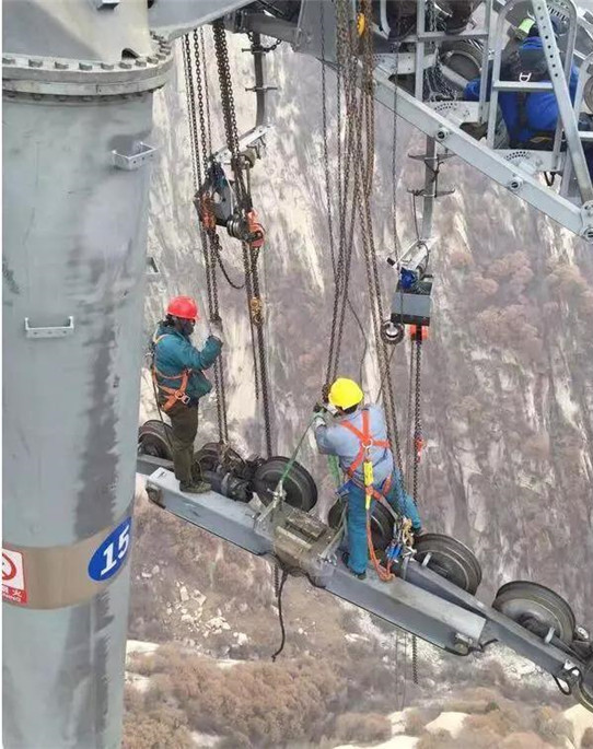 當(dāng)發(fā)現(xiàn)索道支架有異響時,維護工就要上支架了。從檢修車車廂里翻出來、順著掛在鋼索下的車臂攀緣上去,越過鋼絲繩,跨上支架,維護工開始工作。最高的支架65米,站在高聳入云的支架上,有一種站在懸崖邊的感覺。