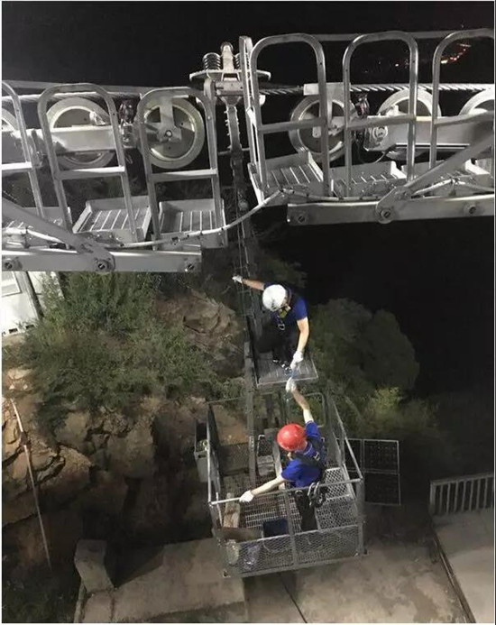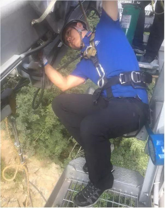 索道維護工每隔2小時坐檢修車沿索道線巡查一次。檢修車四面敞開、像個吊籃一樣。坐在全封閉的索艙里,尚有游客嚇得大喊大叫,站在四面敞開的檢修車上的感覺可想而知。