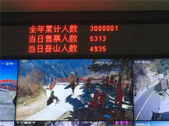 截止2018年10月29 日上午11時(shí)43分,華山景區(qū)購(gòu)票人數(shù)突破300萬(wàn)人次,與去年同期相比增長(zhǎng)60萬(wàn)人次,增長(zhǎng)率25%,創(chuàng)歷史新高。取得這樣喜人的成績(jī),是華旅集團(tuán)引領(lǐng)企業(yè)發(fā)展新航向、上下求索的碩果,是票務(wù)服務(wù)中心及兄弟單位密切配合,扎實(shí)工作,共同努力的結(jié)果,是干部職工上下一心,不辭辛勞,真抓實(shí)干的效果,是海內(nèi)外游客對(duì)華山景區(qū)優(yōu)美景色,優(yōu)質(zhì)服務(wù)認(rèn)可的成果。