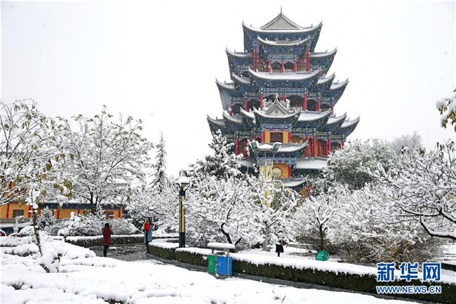 當(dāng)日,甘肅省平?jīng)鍪谐霈F(xiàn)降雪天氣,銀裝素裹的冰雪世界吸引市民前來欣賞雪景。新華社發(fā)(楊昕 攝)