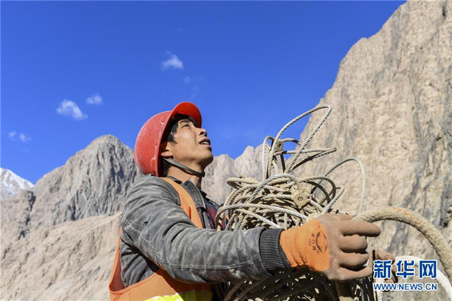 11月12日,在新疆塔什庫(kù)爾干塔吉克自治縣大同鄉(xiāng)鄉(xiāng)政府附近的一處路段,工人背著施工設(shè)備在峭壁上攀爬。 近日,一支由四川、云南等地工人組成的施工隊(duì)忙碌在帕米爾高原深處的大山中,為塔什庫(kù)爾干塔吉克自治縣縣城至大同鄉(xiāng)道路的易落石路段安裝防護(hù)網(wǎng)。崇山峻嶺間,工人要攀爬至峭壁上施工作業(yè),如躍動(dòng)在大山間的“舞者”。據(jù)介紹,這支施工隊(duì)常年活躍在新疆山區(qū)道路的施工現(xiàn)場(chǎng),為風(fēng)險(xiǎn)路段加裝安全防護(hù)裝置,保障過(guò)往車輛和沿途村民出行安全。 新華社記者 胡虎虎 攝