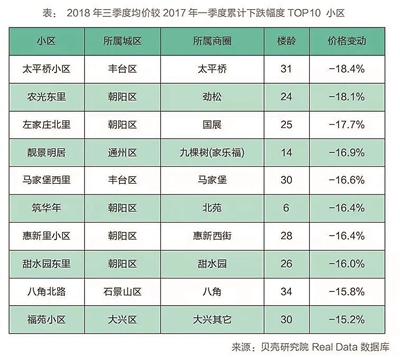 一是品質(zhì)較差的老房子。2018年三季度均價較2017年一季度均價累計跌幅最大的是物業(yè)費低于3塊、30年以上的房屋,表明品質(zhì)差的老房屋抗跌性較弱。比如,石景山由于區(qū)域內(nèi)房源房齡較大,均價回調(diào)幅度也較大,2018年三季度累計跌幅達9.0%。篩選2018年三季度均價跌幅TOP10 小區(qū),多數(shù)樓齡在20年以上。