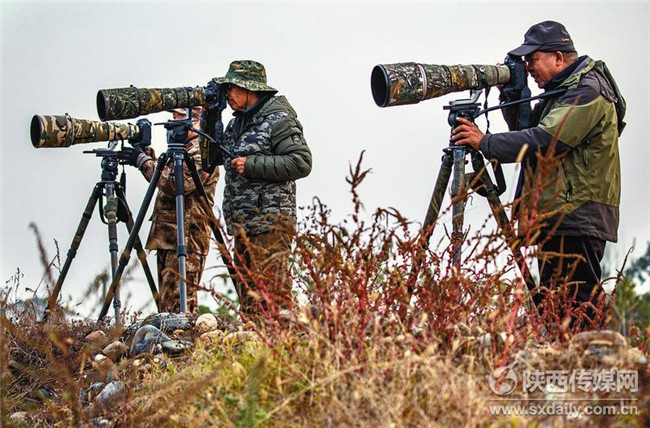 圖為11月21日幾名攝影愛好者在洋縣龍亭鎮(zhèn)鎮(zhèn)江村拍攝朱鹮。