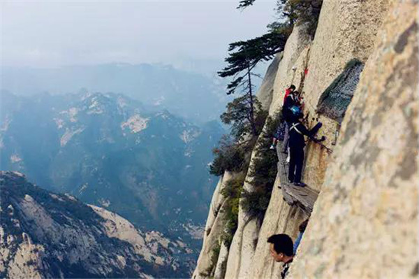 西岳華山歷來被認(rèn)為是五岳之中最為險(xiǎn)峻的,而在華山中,險(xiǎn)中之險(xiǎn)莫過于“長空棧道”和“鷂子翻身”。特別是具有700多年歷史的長空棧道,在華山南峰東側(cè)山腰的萬仞絕壁上鑿出來的幾個(gè)踏腳之處,鑲嵌石釘搭木椽搭建了一個(gè)百余米懸空的棧道,讓人望而卻步,如果你有恐高癥,僅僅看一眼都會(huì)讓你驚恐萬分。2013年,著名旅游網(wǎng)站“Smarter Travel”盤點(diǎn)全球最恐怖懸崖步道,將華山長空棧道列為全球十大最恐怖的懸崖步道之一。