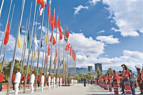 圖為省第十一屆少數(shù)民族傳統(tǒng)體育運動會代表團升旗儀式在臨滄市體育運動中心體育場舉行。夏方海 攝