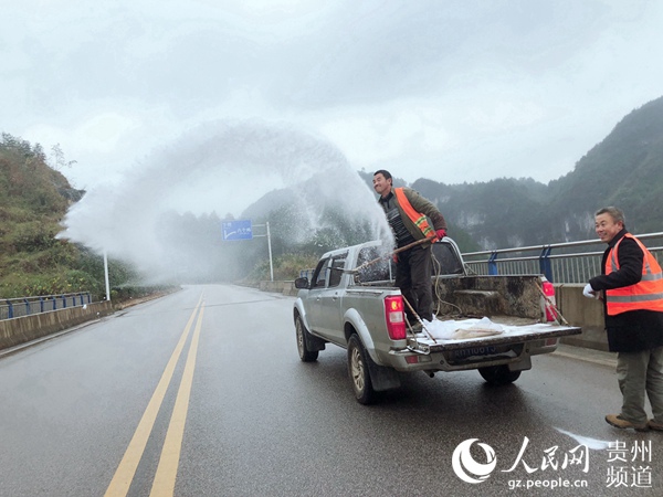 12月9日,在凱里爐山至下司快速通道,路政人員正在撒鹽除冰。潘文華 攝