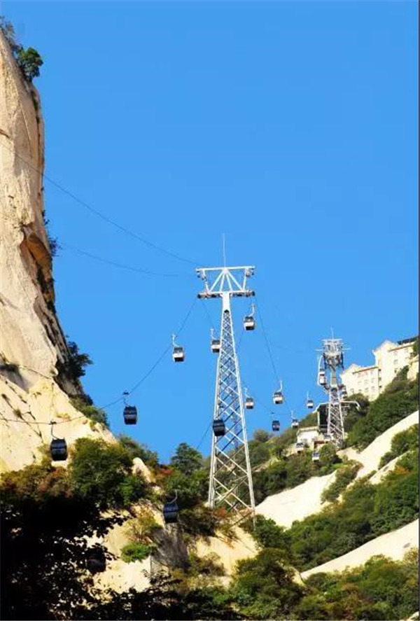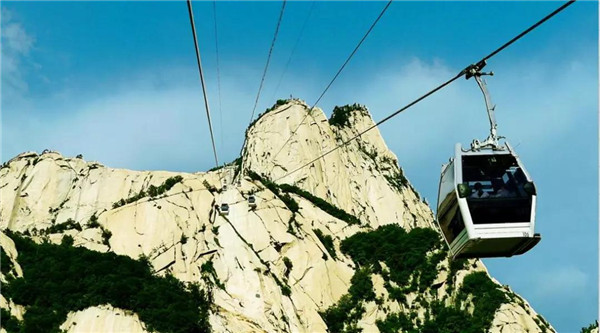 其實,而今作為旅游勝地的華山,已不似古人所記所述,登山道路平整而闊,道旁鐵鏈石欄相護,已無危險之虞,可謂“險而無危”。如今,登頂華山的方式也已經不止步行登山了,索道的建成使更多游人登頂華山的愿望成為現實。