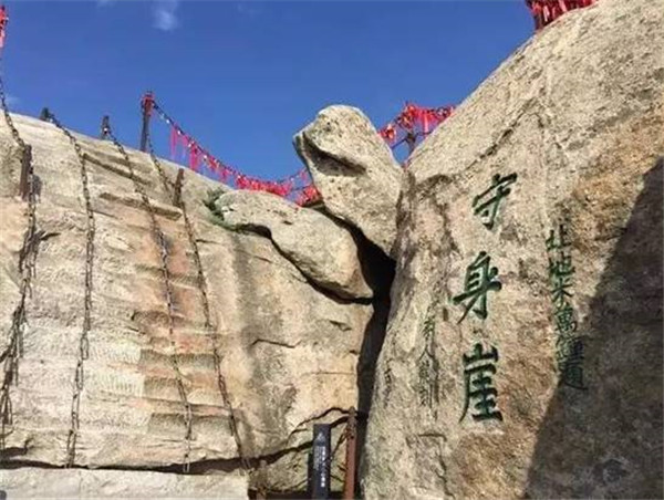 位于華山西峰頂摘星石北。民間傳說古時有個孝子,雙親身染重疾,久治不愈,聽說岳神靈驗,便登山拜神求醫(yī)。在向岳神祈禱的過程中,孝子許愿說只要雙親病愈,愿舍去自己的性命來報答神靈。果然,當(dāng)孝子返回家中時,父母都已康復(fù),且已下田耕作去了。孝子還愿來到華山,毫不猶豫的從此處跳下深淵,可他卻覺得身體若有人托起,似乘長風(fēng),飄飄欲仙。待清醒時,原來依然躺在家中,似夢非夢。孝子知道是華山神暗中相助,便告別父母到華山西峰作了道士。后人被孝子的誠心感動,就將此處命名為舍身崖。 清道光年間李榕的伯祖李仁龍為阻止后人仿效孝子的行為,改舍身崖為省身崖,以警示忤逆之街徒游到這里時應(yīng)對照孝子,自警自省,痛改前非。后來又有人認(rèn)為舍身救雙親的行為并不可取,也稱崖作守身崖,以教育后人生命可貴,不可輕擲。
