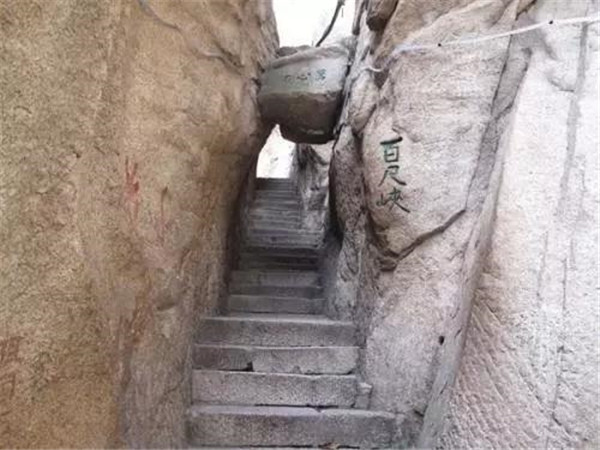 “千尺幢”在華山峪古道“回心石”上,是經(jīng)華山峪登主峰的必經(jīng)之道。這里原為一崖間裂隙,直立70度,后來人們沿隙鑿?fù)爻陕?,有石階370級,階寬僅容半足,游人登臨時(shí),仰視一線天,俯視若臨深井。