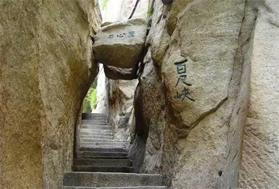 幢去峽復(fù)來,天險不可瞬。雖云百尺峽,一尺一千仞。”過千尺幢向北折即到“百尺峽”,它也叫“百丈崖”,仍是一處危石聳峙,直插云表,令人望而生畏的地方。峽的兩壁欲合,卻被飛來的兩顆石塊從中撐開,人從石頭下鉆過,膽戰(zhàn)心驚,生怕石塊從兩壁間掉下來,這就是“驚心石”。通過此石懸著的心才放下來,再回頭看原來此處卡著的兩塊石頭,是上大下小故能安然無恙,所以這顆石頭也被稱之為“平心石”。故韓愈詩中有“俄然神功就,殺氣見棱角”的描寫。