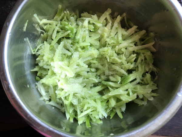2.用刨子刨成細絲,加點鹽腌一下出水