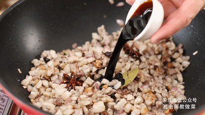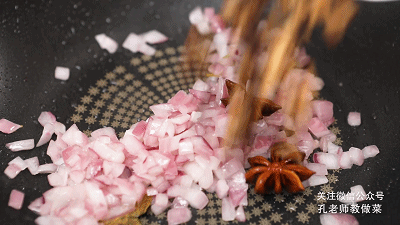 6.鍋中留適量煸炒五花肉的底油,下入洋蔥丁、八角、香葉,一起炒香。